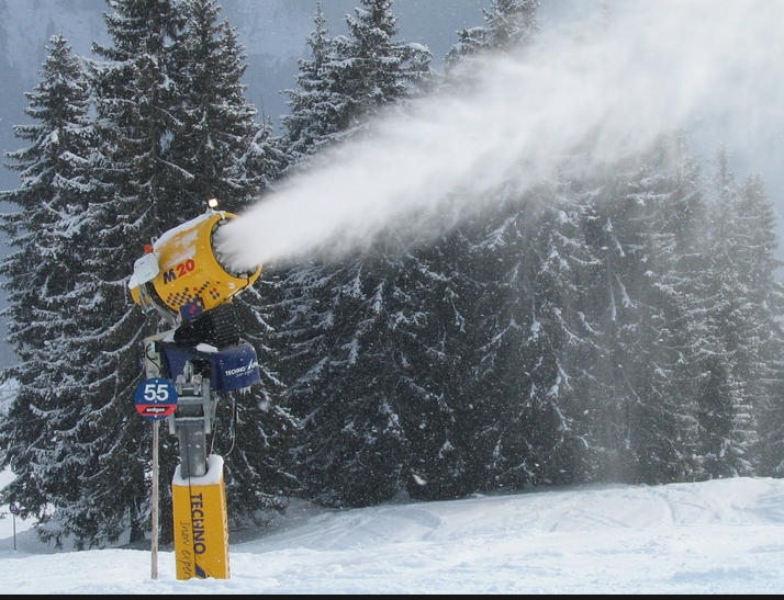 Pour contrer les chutes de neige de moins en moins précoces et les précipitations en recul, les stations de sport d’hiver sont de plus en plus nombreuses à mettre en place des canons à neige, à conditions que les températures soient suffisamment froides. Et ce n’est plus réservé de nos jours aux grandes stations des Alpes ou des Pyrénées. Dans l’Ain, on s’y est mis également comme l’an passé sur le domaine d’Hauteville la Praille même si pour cette station de moyenne altitude les pistes n’ont fonctionné qu’une dizaine de jours. Dans un proche avenir, des canons apparaitront sur le plateau du Retord. Cela fait plus de 50 ans que le premier canon à neige a fonctionné en France sur une piste de 550 m au Champ du Feu dans le Bas Rhin. 20 ans plus tard en 1973 Flaine fut la première station européenne à s’équiper. Utilisé pour assurer un enneigement suffisant des pistes, ce procédé est actuellement en fort développement en début de saison dès la mi novembre parfois, de manière à assurer la période de ski, et l’ouverture de la station à date fixe, le souvent vers la mi décembre comme dans c’est le cas dans l’Ain. Certains rares sites de ski d’été sur glacier en sont également équipés même si leur avenir est de plus en plus incertain avec le réchauffement climatique. De manière plus globale, ces systèmes d’enneigement sont positionnés sur les pistes principales et donc les axes principaux des domaine skiables. En France en 2009, 20 % des pistes étaient équipées de canons à neige, ce qui au final n’est pas exceptionnel. Avec ces canons à neige, l’enneigement artificiel permet d’augmenter ou du moins maintenir le nombre de jours de pratique du ski et de permettre le retour vers les stations skis aux pieds quand la neige manque sur les pentes les plus basses ou sur les liaisons vers les zones plus longtemps enneigées du domaine. Il existe à l’heure actuelle trois types de techniques pour enneiger les domaines : des canons ventilateur ou monofluide, des canons et perches air et eau ou bifluide et enfin les canons tous-temps qui produisent de la neige à partir de particules de glace obtenues par congélation d’eau par n’importe quelle température externe avec l’aide de machines frigorifiques. Les canons air et eau utilisent des compresseurs centralisés qui fournissent l’air comprimé nécessaire à la nucléation et/ou à l’atomisation de l’eau. Les canons ventilateur produisent eux-mêmes leur air comprimé grâce à un petit compresseur embarqué qui ne sert qu’à la nucléation. Dans les deux cas un réseau d’eau sous pression est nécessaire, sa pression sera fonction du dénivelé de l’installation d’enneigement. Pour obtenir la cristallisation (ou nucléation), on mélange de l’eau avec de l’air comprimé, à l’intérieur de « canons » de petit gabarit. La tête des enneigeurs air et eau est généralement placée en hauteur (de 2,5 à 10 mètres) afin d’assurer un temps de chute suffisant (balistique) pour permettre aux gouttelettes d’eau de changer d’état. Le canon ventilateur assure la balistique nécessaire à la génération de neige par le biais du flux d’air froid produit par son gros ventilateur.