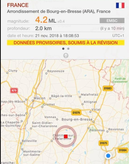 Un grand vrombissement comme une onde de propagation a été ressenti à 18h08 heure locale sur la Bresse, la Dombes et le Bugey comme sur Pont d’Ain où est basé notre site internet. Les mesures du Réseau National de Surveillance Sismique Français ont confirmé qu’il y a eu une secousse sismique séisme. Celle-ci aurait eu son épicentre lors des premières informations entre Buellas et Montracol, à environ 7 km de Bourg en Bresse et à une profondeur d’environ 10 km de la surface du globe avant de finaliser sa position à 15 km au sud ouest du chef lieu du département de l’Ain, près de Chatillon sur Chalaronne et à seulement 2 km de profondeur . La magnitude enregistrée aurait atteint les 4,2 sur l’échelle de Richter à son épicentre. Un niveau relativement élevé pour notre région qui n’est pas à proprement soumise à une très forte activité sismique en temps normal même si la sismologie y est classée comme modérée. En tout cas, les experts s’accordent à dire que c’est un niveau de secousse classé léger et fréquent avec des dommages faibles. Il s’en produit 6000 par an selon le site Wipikédia. Cette secousse sismique est la 4e enregistrant plus de 4 d’intensité dans l’Ain dans un rayon de 100 km de ce séisme depuis 1970. Autant dire que l’intensité ressentie ce soir est exceptionnelle où l’on ne comptabilise pas plus de 3 séismes tous les 10 ans avec une magnitude supérieure à 3. Ainsi, suite à ce constat, la secousse ne doit pas être inquiétante même si très localement quelques dommages comme des fissures auront pu être constatés. La secousse a été ressentie ainsi tout particulièrement sur un périmètre de 50 km autour de l’épicentre, sur de nombreuses communes comme le confirme les nombreux témoignages sur notre page Facebook et même parfois très localement jusqu’aux portes du Rhône ou de l’Isère : Péronnas, Viriat, Chatillon sur Chalaronne, Polliat, Méximieux, Cuisiat, et même jusqu’à Sault Brénaz. Il faut noter que depuis ces derniers mois, la terre tremble régulièrement à des niveaux de magnitude assez bas sur les Alpes mais également dans le Bugey sans dommages notables. Le 30 septembre, un séisme de magnitude supérieure à 3 avait ainsi déjà été enregistré dans le Bugey à proximité de Bellegarde sur Valserine.