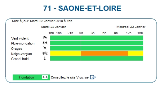 La prévision est confirmée. La Côte-d’Or et la Saône-et-Loire sont placées en vigilance orange à partir de 00h cette nuit et ce jusqu’à 11 h ce mercredi matin.