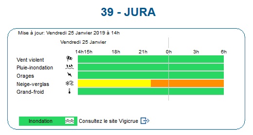 Météo France place à compter de 21 h le département du Jura en vigilance neige et verglas et ce jusqu’à 6 h demain matin.