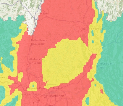 Dans l’Ain, la qualité de l’air est restée très mauvaise sur la frange Ouest le long de la Saône, dans le nord de la Bresse, de Pont d’Ain jusqu’à la Côtière. Alors qu’il y eu du mieux au centre du département en couleur jaune. L’est de l’Ain restant au vert.