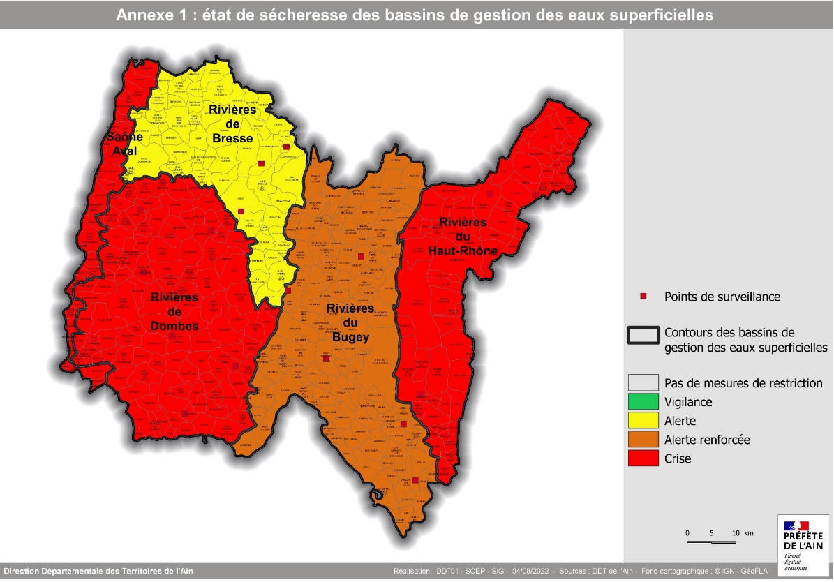 de placer les bassins de gestion eaux superficielles « Rivières de Dombes », « Rivières du Haut Rhône » et « Saône aval » en situation de crise ;