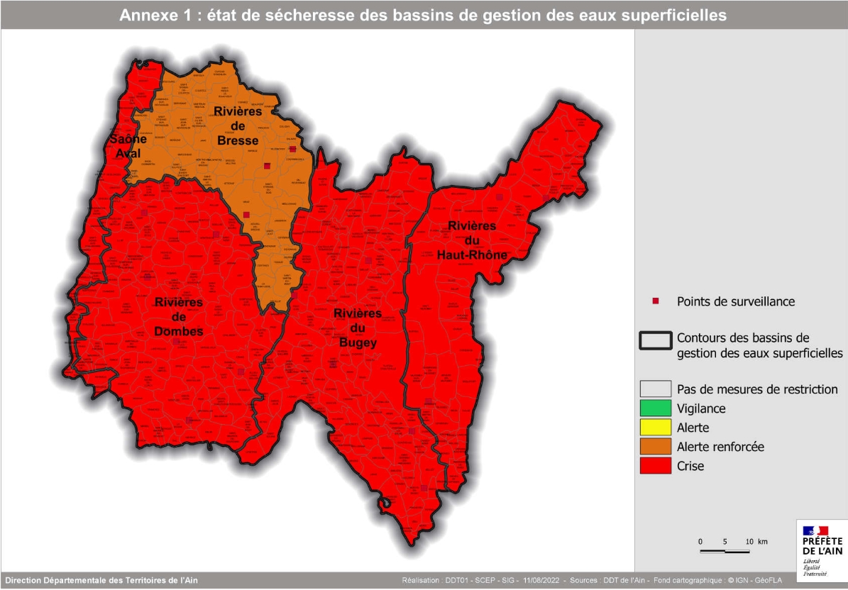 placer le bassin de gestion eaux superficielles « Rivières du Bugey » en situation de crise ;