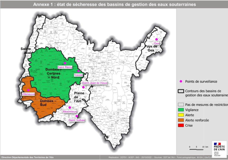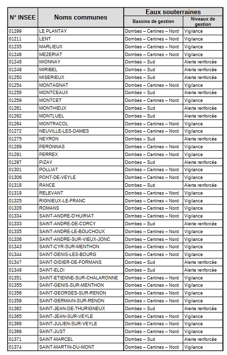 • maintenir le bassin de gestion eaux souterraines « Dombes-Certines-Nord » en situation de vigilance.