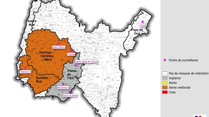 - placer le bassin de gestion eaux souterraines « Dombes – Certines – Nord » en situation d’alerte renforcée ;