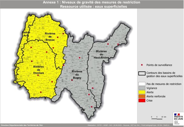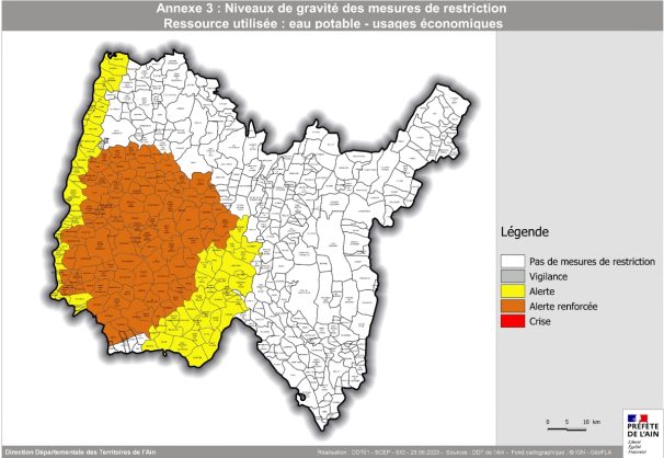 Dans un tel contexte, à l’issue d’une seconde réunion du comité restreint dédié à la gestion conjoncturelle de la sécheresse organisée le 29 juin 2023, la préfète de l’Ain a décidé de :