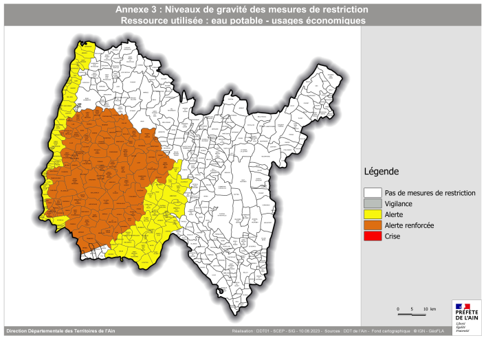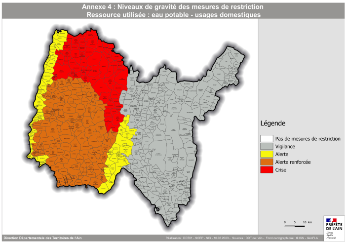 Dans un tel contexte, à l’issue d’une quatrième réunion du comité restreint dédié à la gestion conjoncturelle de la sécheresse organisée le 10 août 2023, la préfète de l’Ain a décidé de :