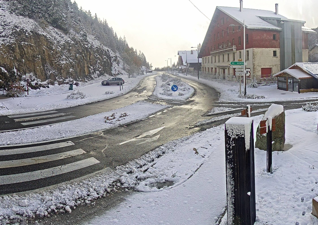 Des flocons ont même été signalés localement un peu plus bas à la faveur de la baisse du thermomètre comme sur les hauteurs de Brénod à 850 m d’altitude sans pour autant tenir au sol alors que le mercure flirtait avec la barre du 0°. Le col de Belleroche de son côté a été recouvert d’une légère parure blanche alors que les couleurs automnales offrent un joli contraste.