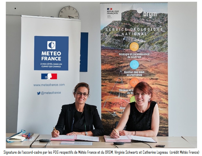 Ce 11 juillet, la présidente directrice générale de Météo-France, Virginie Schwarz, et la présidente directrice générale du Bureau de recherches géologiques et minières (BRGM), Catherine Lagneau, ont signé un accord-cadre destiné à renforcer les liens scientifiques entre les deux établissements. Compte tenu de leurs complémentarités pour répondre aux enjeux climatiques, leurs présidences ont souhaité formaliser le cadre de leur future collaboration institutionnelle.