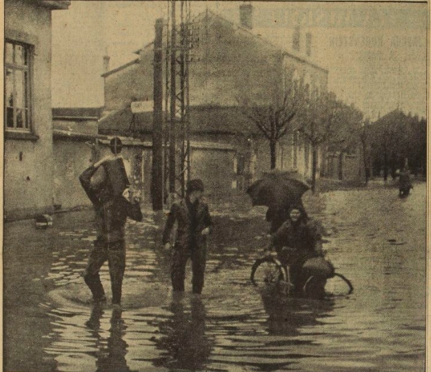 A Bourg en Bresse, la situation a pris ce dimanche 12 novembre une tournure assez grave tout comme dans beaucoup de secteurs du département. La Reyssouze si souvent pacifique s’ est mise en colère et la route de Ceyzériat a été submergée. Les rez de chaussées, les caves des immeubles furent envahis. Le niveau d’ eau atteignait par endroits les 50 cm de hauteur et il a fallut improviser des trottoirs surélevés pour permettre aux habitants de circuler. A la Drague, les installations d ‘une poissonnerie étaient submergées et les locaux d’ habitation voisins ainsi que les bureaux étaient évacués par mesures de sécurité. Une grande partie du stade Verchère et le terrain d’ entrainement n’ étaient plus qu’ une nappe d’ eau. De chaque côté de l’ allée de Challes, la rivière et le canal arrivaient à plein bords, menaçant la route et pénétrant dans certaines maisons ainsi que sur les terrains situés en contre-bas. Au Pont des Chèvres vers les cités de Rosière la crue était menaçante. Des précautions furent assez vite prises par les services compétents pour assurer au mieux l’ évacuation de l’ eau en débouchant certains caniveaux.