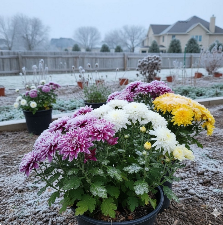Les chrysanthèmes en pot sont plus sensibles aux gelées que ceux en pleine terre. Un substrat riche en matière organique retient mieux l’humidité et offre une légère isolation thermique. L’arrosage doit être modéré : un substrat légèrement humide protège les racines, mais l’excès d’eau favorise les pourritures. Vous pourriez vérifier quotidiennement le sol, surtout après des périodes douces suivies d’un gel nocturne.