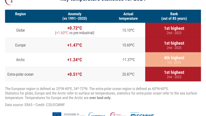 - 2024 a été l’année la plus chaude jamais enregistrée en Europe, avec une température moyenne de 10,69°C, soit 1,47°C au-dessus de la moyenne de la période de référence 1991-2020 et 0,28°C plus chaude que le précédent record établi en 2020.