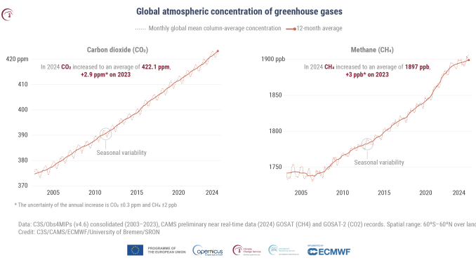 Statistiques clés sur les températures pour 2024. Les statistiques pour le globe, l’Europe et l’Arctique se réfèrent aux températures de l’air en surface, les statistiques pour l’océan extrapolaire se réfèrent aux températures de la surface de la mer. Source des données : ERA5. Crédit : C3S / ECMWF. Les concentrations atmosphériques de dioxyde de carbone et de méthane ont continué d’augmenter et ont atteint des niveaux annuels record en 2024, à 422 parties par million (ppm) et 1897 parties par milliard (ppb) respectivement. Les concentrations de dioxyde de carbone en 2024 étaient de 2,9 ppm supérieures à celles de 2023, tandis que les concentrations de méthane étaient de 3 ppb supérieures.