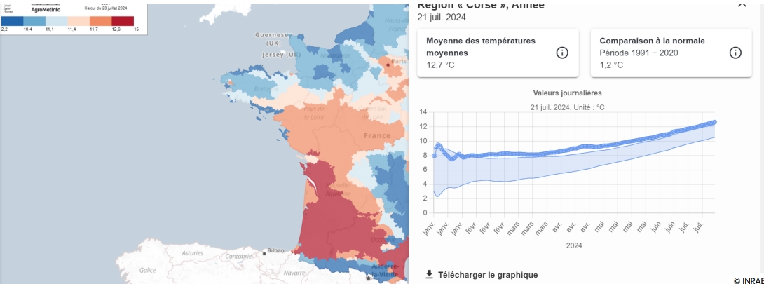 La dérégulation du climat entraine des changements importants des conditions météorologiques pendant la période de croissance des cultures, essentiellement des variables thermiques (avec des températures extrêmes plus élevées et/ou plus fréquentes) ou hydriques (avec de très fortes variations de la pluviométrie). Avec une série d’indicateurs agroclimatiques, par exemple le nombre de jours où la température est supérieure à 25°C ou 35°C, ou encore le nombre de jours de gels, pour une période et un territoire donné, il s’agit, pour les chercheurs d’INRAE, d’offrir un outil pour apprécier l’influence des conditions météorologiques en cours de saison agricole et d’anticiper l’impact qu’elles peuvent avoir sur le développement des cultures.