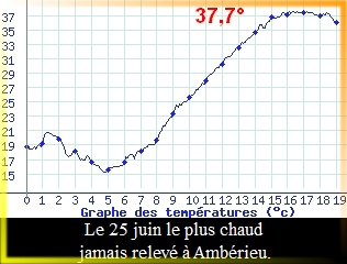 On a ainsi noté pas moins de 37,7° à la station d’Ambérieu en Bugey (12, 7°) battant le record de 2003 avec ses 35,9°, 37,9°sur les bords de l’Ain à notre station de Pont d’Ain. Tout proche, sur les rivages de Priay, le thermomètre affichait 37,1°.