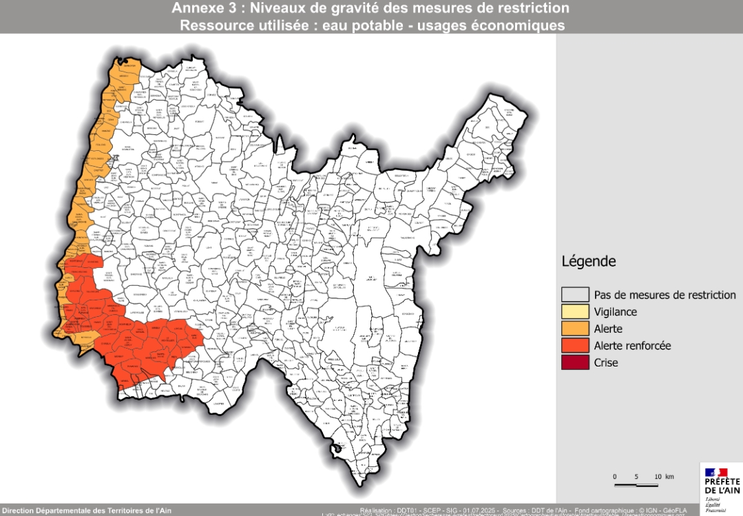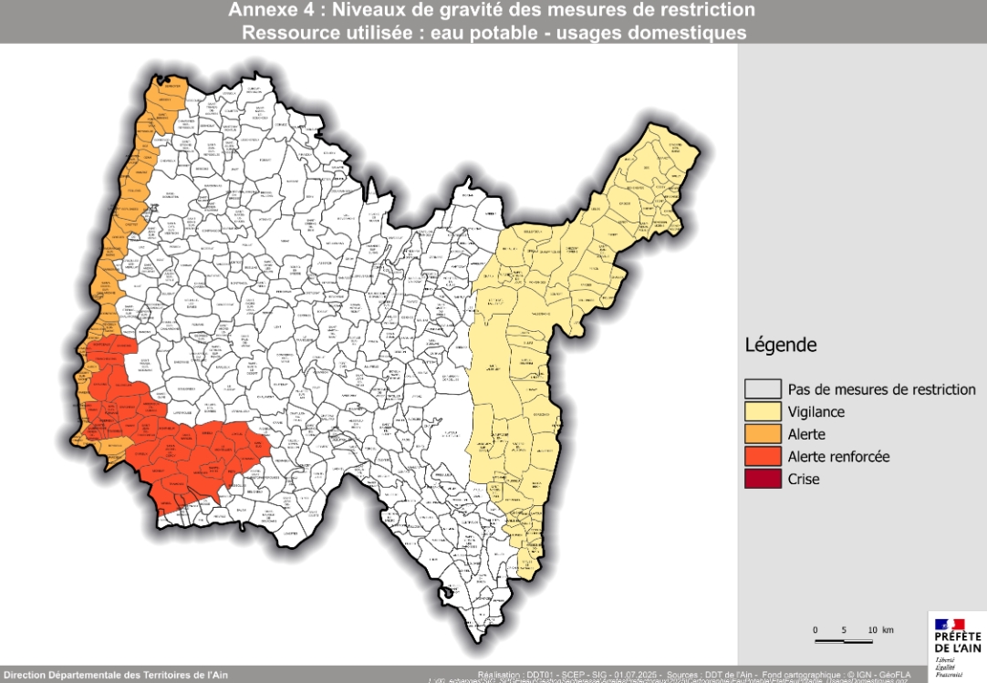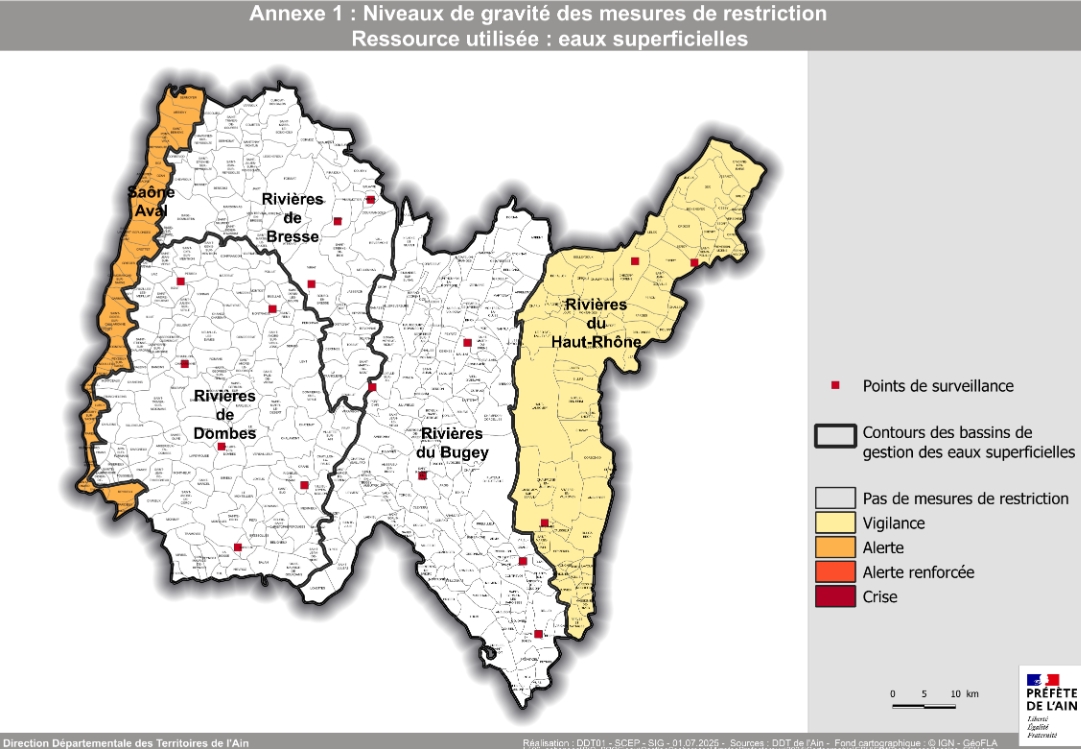 Dans un tel contexte, à l’issue d’une consultation écrite des membres du comité départemental restreint dédié à la gestion conjoncturelle de la sécheresse organisée du 1er juillet 2025 au 3 juillet 2025, la préfète de l’Ain a décidé de :