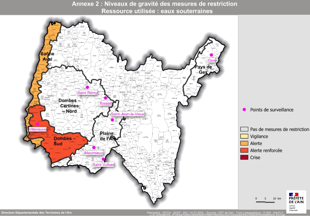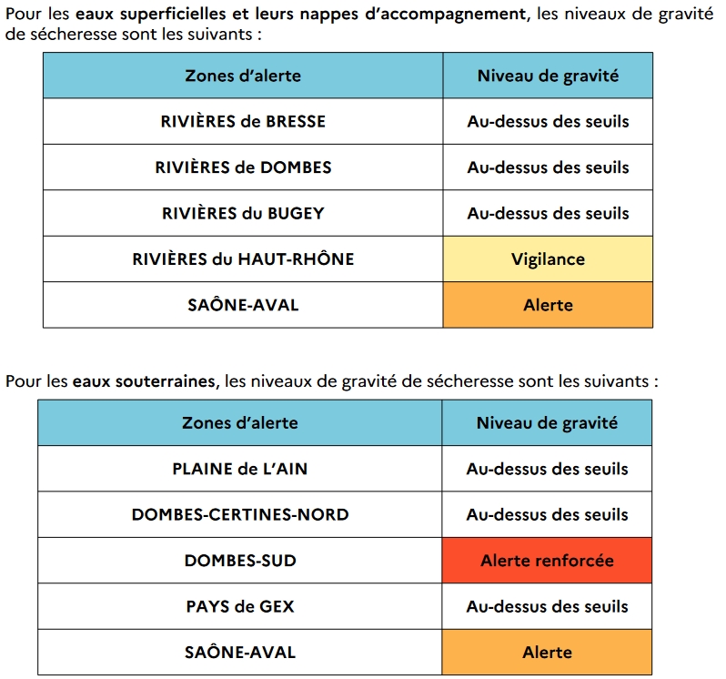 - maintenir la zone d’alerte eaux souterraines « Dombes-Sud » en situation d’alerte renforcée.