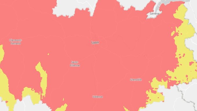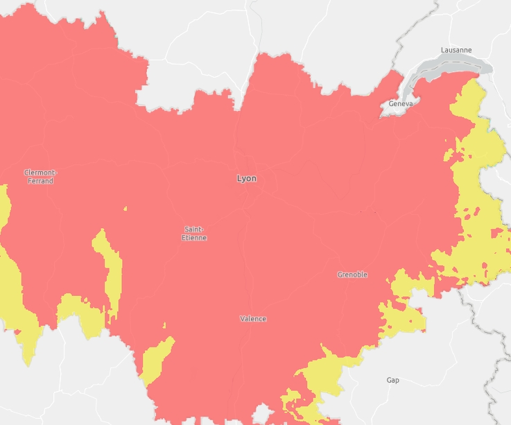 Aujourd’hui, les conditions caniculaires rendent possibles des dépassements du seuil d’information de la Plaine de l’Ain et des contreforts du Massif Central jusqu’au sud lyonnais.