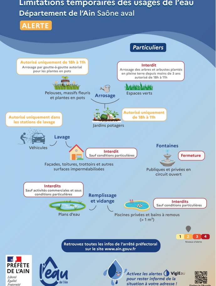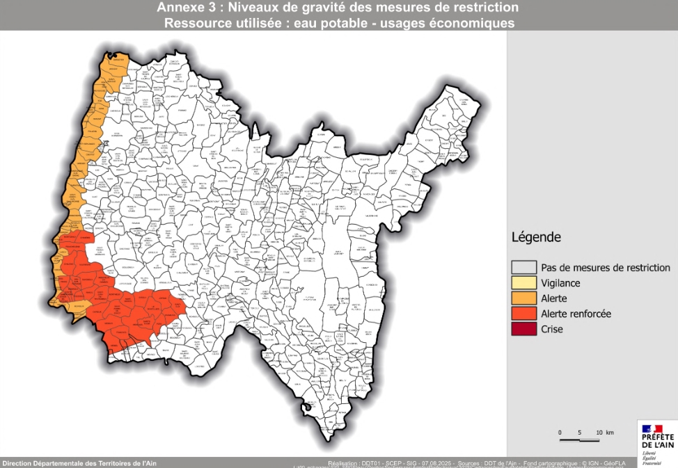 Dans un tel contexte, à l’issue d’une consultation écrite des membres du comité départemental restreint dédié à la gestion conjoncturelle de la sécheresse organisée du 5 au 7 août 2025, Virginie Guérin-Robinet, secrétaire générale de la préfecture de l’Ain, a décidé de :