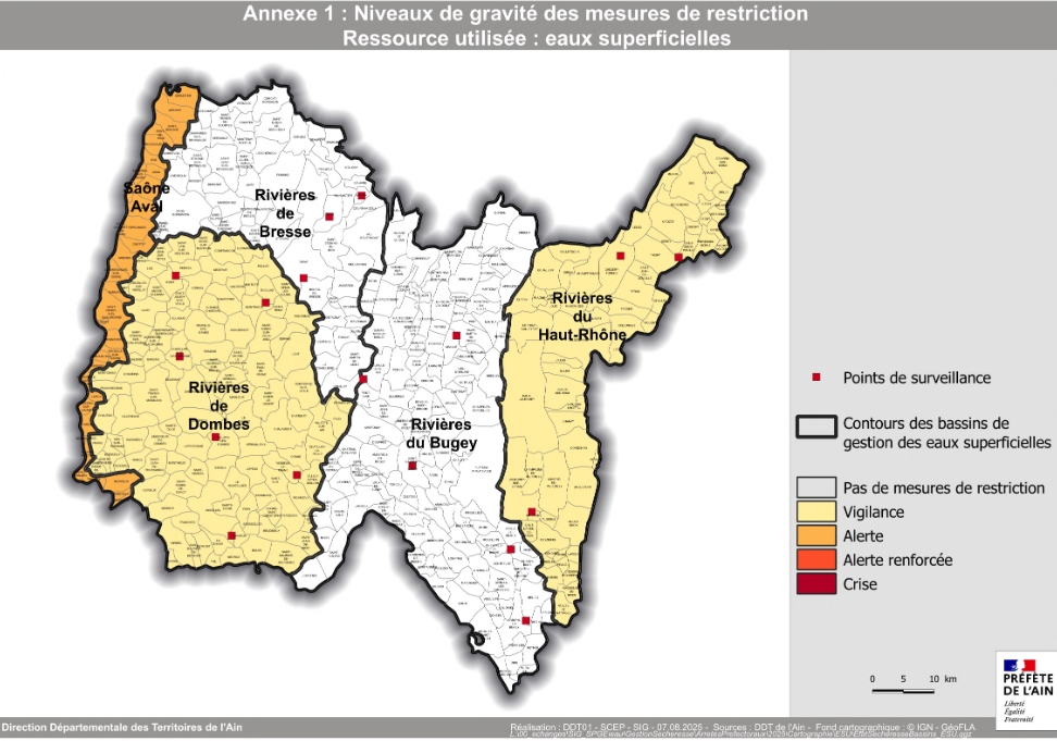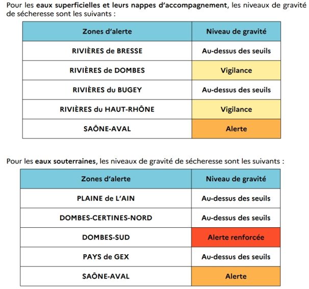 Ces conditions climatiques entraînent une baisse des débits des cours d’eau plus marquée sur la Dombes, ce qui justifie un placement en situation de vigilance des cours d’eau de la zone d’alerte « Rivières de Dombes ». Sur le Pays de Gex et le Haut Jura, les débits des cours d’eau se maintiennent au gré des quelques orages de la mi-juillet, mais restent en situation de vigilance. Sur la Saône, les débits restent bas et justifient le maintien en situation d’alerte. Pour le reste du département (Bresse et Bugey), les débits sont en baisse mais restent au-dessus des seuils de l’arrêté-cadre « sécheresse », grâce à des orages localisés.