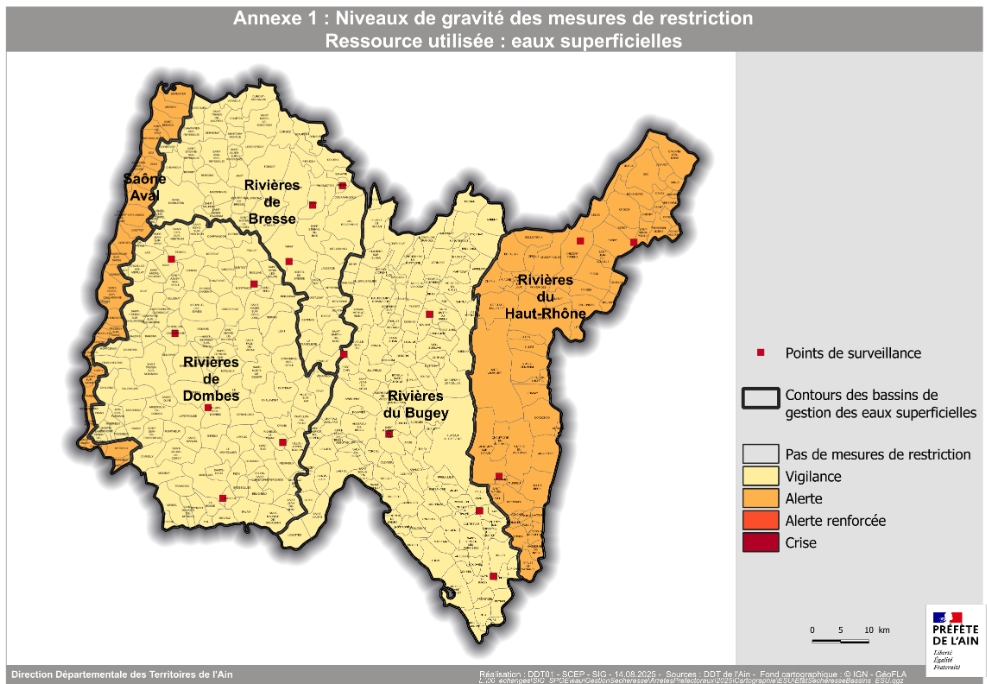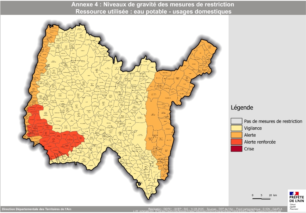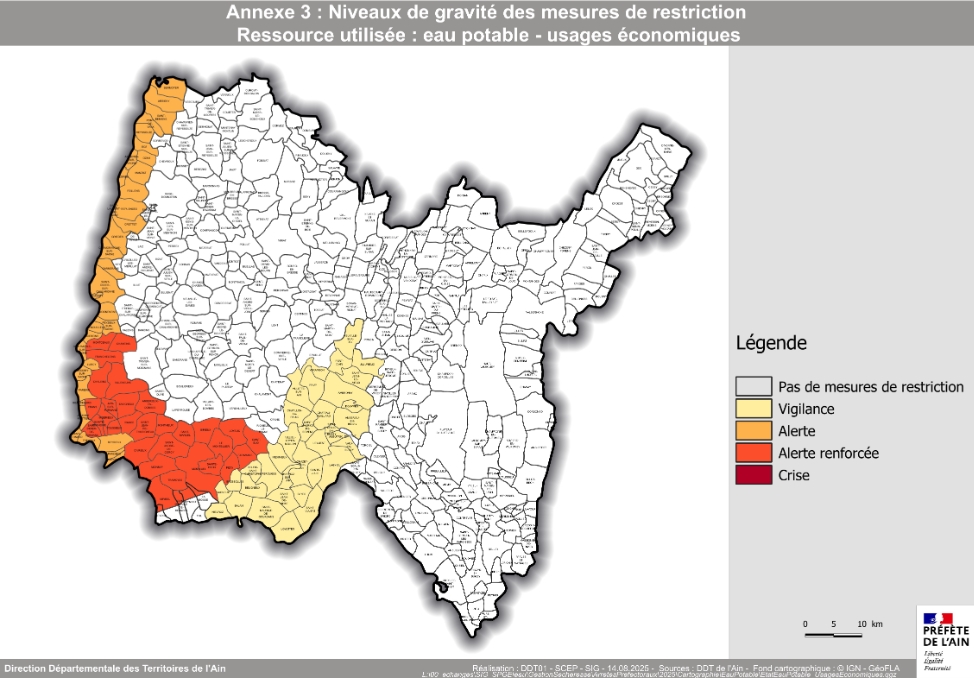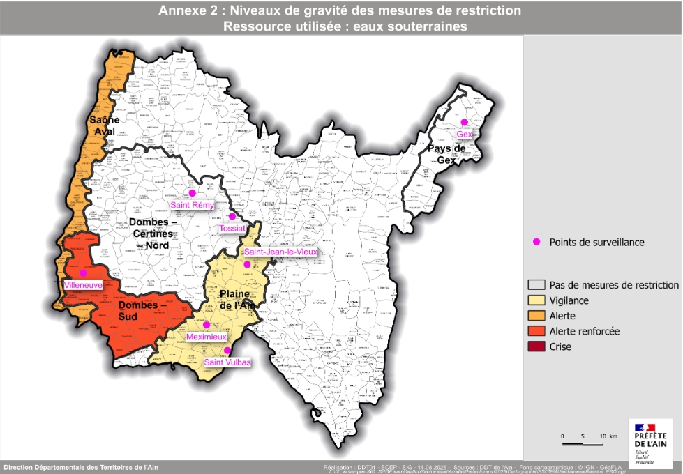 Dans un tel contexte, à l’issue d’une réunion du comité départemental restreint dédié à la gestion conjoncturelle de la sécheresse qui s’est tenue le 14 août 2025, Virginie Guérin-Robinet, secrétaire générale de la préfecture de l’Ain, a décidé de renforcer les dispositions relatives à la sécheresse qui étaient en vigueur depuis le 8 août 2025 en :