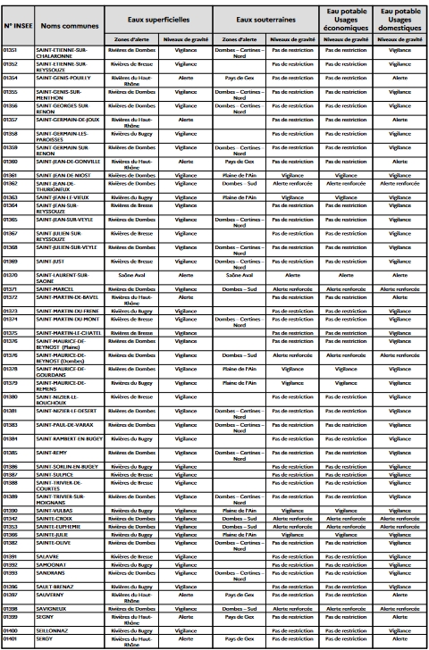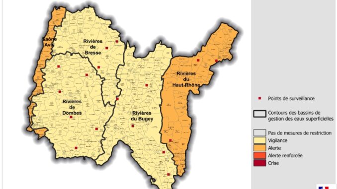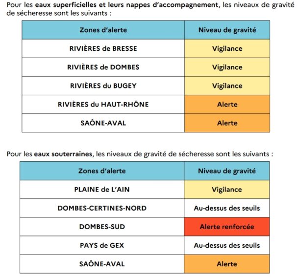 - plaçant la zone d’alerte eaux superficielles « Rivières de Bresse » en situation de vigilance ;