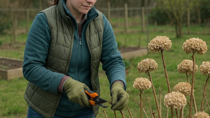 Taille complémentaire : Pour les hortensias à bois neuf (H. paniculata, H. arborescens), couper les branches âgées ou mal formées pour préparer la structure de l’année suivante.