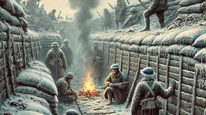 Les hivers de la guerre, de 1914 à 1918, ont été marqués par des vagues de froid parfois intenses. L’hiver 1914-1915 fut particulièrement rigoureux sur le front de l’Ouest, avec des températures régulièrement descendues en dessous de -10°C. Les précipitations neigeuses étaient fréquentes et abondantes, et la neige, lorsqu’elle tombait sur les tranchées, transformait ces lieux déjà insalubres en véritables pièges glacés. La boue gelée alternait avec la glace, rendant les déplacements périlleux et ralentissant l’approvisionnement des lignes avant. Des journaux de régiments notent que certaines nuits, la température ressentie pouvait descendre jusqu’à -15 ou -20°C, compte tenu du vent et de l’humidité. Les hivers suivants ont montré des variations plus modérées, mais aucune période de froid prolongé n’a été épargnée aux soldats.