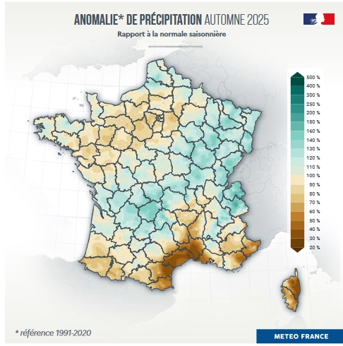 Les précipitations de cet automne ont été globalement conformes à la moyenne nationale, mais avec des disparités régionales marquées. Après deux automnes très pluvieux en 2023 et 2024, la saison 2025 se distingue par un retour à la normale à l’échelle de la France, masquant toutefois des contrastes forts. Du nord de la Nouvelle-Aquitaine jusqu’au nord des Alpes, les précipitations ont été excédentaires de 20 à 40 %, alors que les régions allant de l’embouchure de la Loire au Bassin parisien, et le long des Pyrénées, ont enregistré des déficits de 10 à 20 %. Le déficit le plus sévère a été observé sur le Languedoc-Roussillon, la Côte d’Azur et la Corse, avec des anomalies dépassant parfois 50 %. Sur ces zones, vous avez pu constater moins de jours de pluie que d’habitude, avec un déficit de 5 à 10 jours, ce qui a des implications directes sur les réserves hydriques et l’activité agricole.