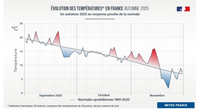 L’automne 2025 en France s’inscrit dans une continuité climatique intrigante, où la normalité apparente masque une saison riche en contrastes et en événements météorologiques exceptionnels. Les températures globales de la saison ont été globalement conformes aux moyennes établies entre 1991 et 2020, avec une température moyenne de 13,7 °C, soit une légère anomalie positive de +0,3 °C. Cette valeur, certes proche de la normale, n’empêche pas d’observer des fluctuations significatives sur les différents mois et régions, révélant une saison aux multiples visages.
