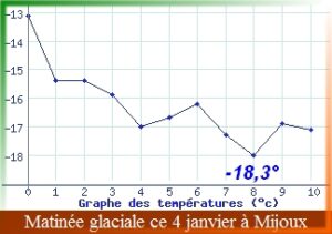 Et puis citons quelques autres secteurs avec minimales à 2 chiffres parfois seulement dès 400 m d’altitude :-10,3° au Sorgia, -10,6° à Cormaranche en Bugey, -11,1° à Nantua, -11,3° à Lelex, -11,5° à St Germain de Joux, -11,9° au sommet de Montoisey, -15,3° au Petit Abergement, et le record revient à Mijoux avec -18,3° !