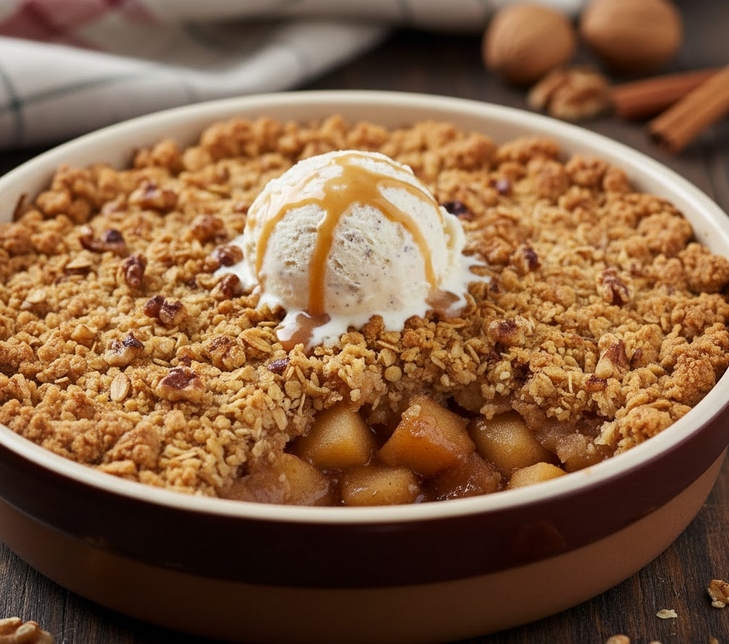Coupez deux pommes et deux poires en dés, mélangez‑les avec 20 g de sucre et une pincée de cannelle, répartissez dans un plat. Préparez un crumble avec 100 g de farine, 80 g de beurre et 80 g de noix concassées, émiettez‑le sur les fruits. Enfournez 35 minutes à 180 °C jusqu’à ce que le dessus soit doré. Le temps de préparation est de 15 minutes. Ce dessert généreux donne pour une portion standard environ 310 kilocalories, combinant la douceur des fruits et le croquant des noix.