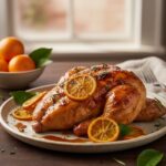 Préchauffez votre four à 200 °C. Préparez un poulet de 1,6 kg, enduisez‑le d’huile d’olive, d’herbes de Provence, d’un peu de sel et de poivre. Dans un plat, disposez 150 g de noix concassées, une carotte et un oignon en quartiers, puis posez le poulet dessus. Arrosez d’un demi‑verre de vin blanc sec. Rôtissez pendant 75 minutes, en arrosant toutes les 15 minutes avec le jus de cuisson. Le temps de préparation et d’assaisonnement est d’environ 15 minutes supplémentaires. Une portion de 250 g de ce poulet avec légumes contient approximativement 380 kilocalories, dont un apport protéique de près de 35 g, fournissant une base solide pour un dîner familial.