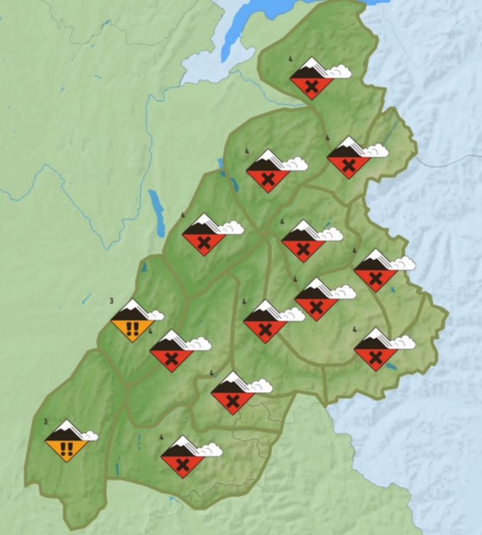 Météo-France classe tous les massifs savoyards en risque avalanche fort à hauteur de 4/5 sur la journée de lundi. La tendance est similaire pour mardi. Ce niveau de risque témoigne de l’instabilité généralisée du manteau neigeux. De nombreux départs spontanés de très grandes avalanches, parfois d’ampleur exceptionnelle, sont à attendre, y compris en terrain peu raide.