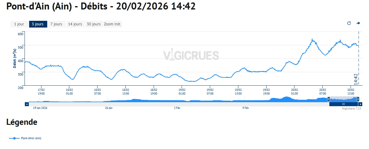 Sans commune mesure avec ce qui se passe dans le SO, les rivière dans l’Ain réagissent plus ou moins ces derniers jours selon les quantités de pluies tombées et selon la variation de la limite pluie/neige assez fluctuante d’un jour à l’autre.