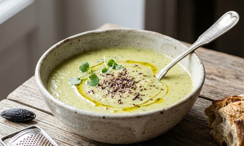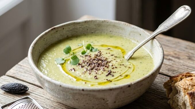 Analyse sensorielle : cette soupe allie douceur des courgettes et complexité aromatique de la fève tonka, qui agit presque comme un « sel aromatique naturel » en réduisant le besoin d’ajout de sel.