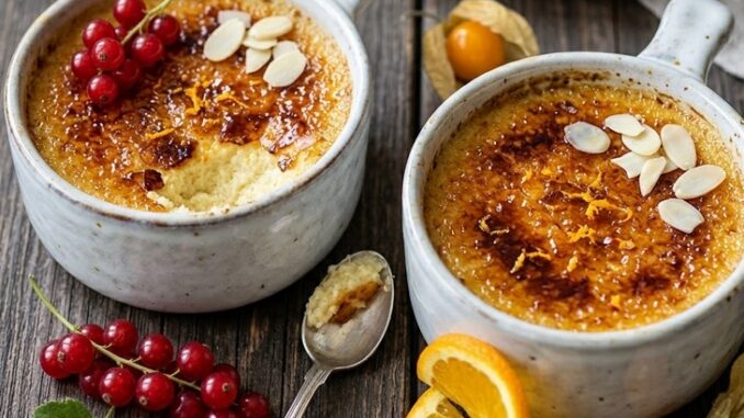 Au printemps, lorsque les marchés se remplissent d’agrumes tardifs, une variation mérite toute votre attention : la crème brûlée à la semoule et à l’orange. Cette association peut surprendre au premier abord. La semoule rappelle souvent les desserts d’enfance ou les recettes familiales simples. Pourtant, associée à la technique de la crème brûlée, elle donne un résultat très élégant : une texture légèrement plus consistante, une saveur céréalière discrète et une base parfaite pour accueillir les arômes d’orange.