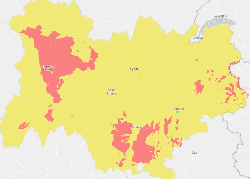 Pour vendredi,le risque faible concernera toute la moitié nord de la région. Le Cantal et de la Haute Savoie à Grenoble seront en risque rouge, soit élevé. L’Ardèche et quelques zones alpines seront en mode dégradé.