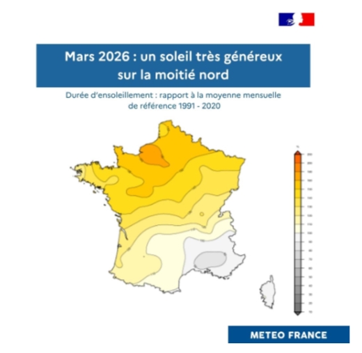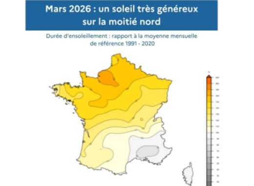 Si l’on devait dresser une liste des éléments les plus notables, vous retiendriez d’abord cette anomalie thermique de +0,9 °C à l’échelle nationale, qui confirme la tendance au réchauffement des mois de mars récents. Vous noteriez ensuite le déficit pluviométrique d’environ 20 %, avec des contrastes régionaux très marqués. Vous observeriez également un excédent d’ensoleillement de l’ordre de 10 %, porté principalement par la moitié nord.