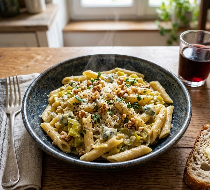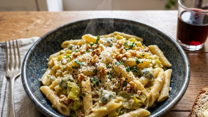 Au moment où le printemps s’installe, avec ses températures plus douces et ses marchés qui retrouvent une forme de diversité végétale, certains plats ont cette capacité à rester réconfortants tout en basculant vers quelque chose de plus léger dans la sensation. Les pâtes aux poireaux et au gorgonzola appartiennent exactement à cette catégorie. Ce n’est pas un plat spectaculaire, mais il repose sur une mécanique culinaire très précise : l’équilibre entre le sucre végétal du poireau, la puissance lactée et persillée du gorgonzola, et la structure amidonnée des pâtes qui sert de liant global.